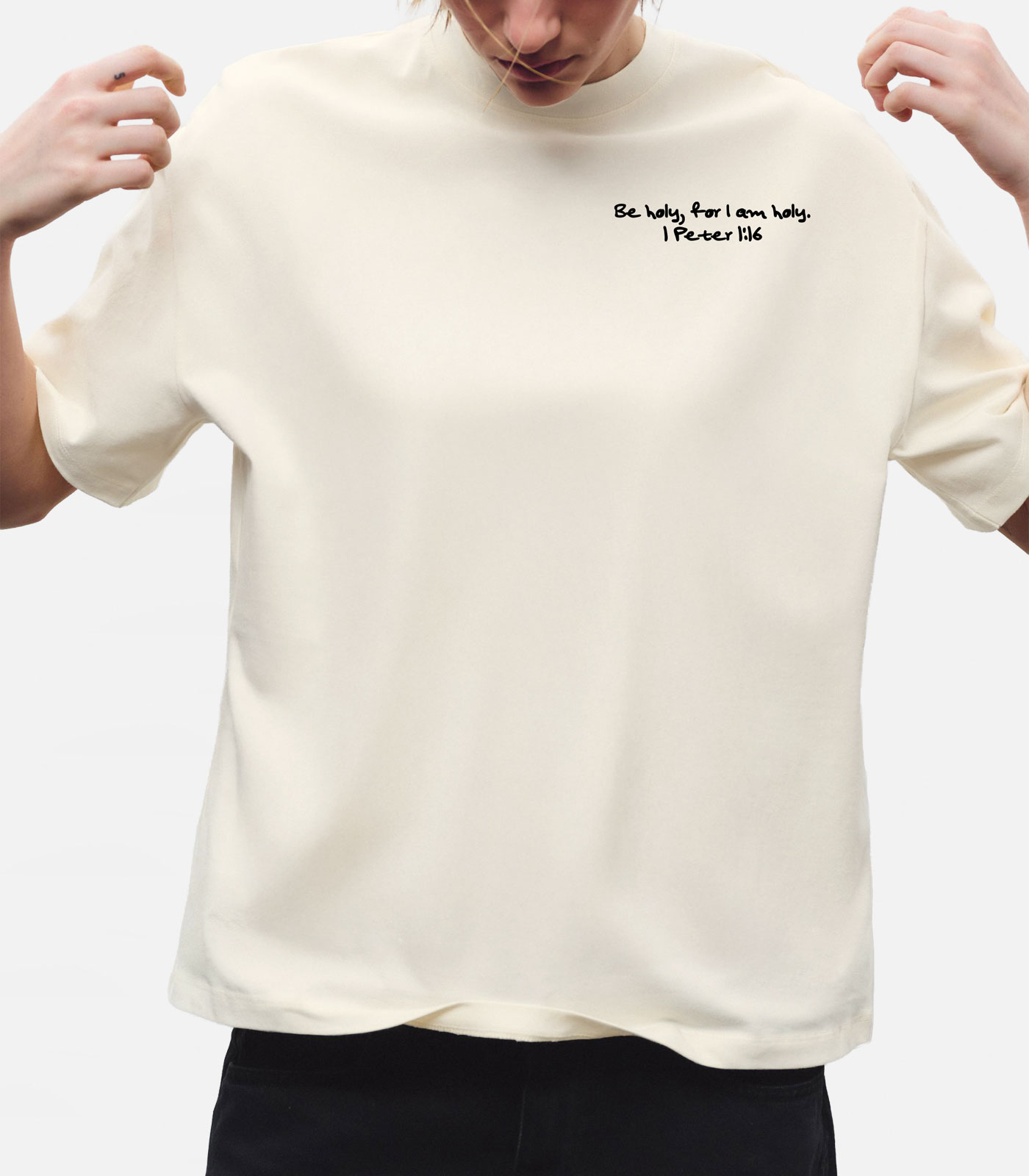 The front features a powerful embroidered Bible verse: “Be holy, for I am holy” (1 Peter 1:16), stitched with care to give a textured, lasting impact. The back is screen printed with a dynamic detailed and distinctive laurel-thorns emblem. A fusion of the laurel-thorns expands into a full artwork that radiates spiritual resilience. The laurel represents victory and divine triumph, while the crown of thorns reminds us of sacrifice and redemption — together, they symbolize the strength that comes through prayer. Surrounding the design is the bold phrase “Prayer Works”, anchoring the message that faith is not just belief — it’s action.